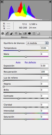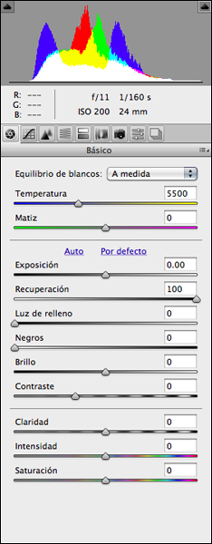 Una opció amb tots els ajustatges d’exposició, to i contrast a “cero” i el cursor de Recuperación al 100%, permet visualitzar una versió molt diferent de la imatge. Ara el contrast és molt baix en tota la imatge. La visió resulta plana i sense massa interès, però l’histograma mostra com no hi cap píxel de la imatge saturat a “blanc 255” ni mancat d’informació a “negre 0” .