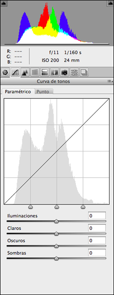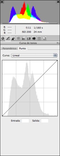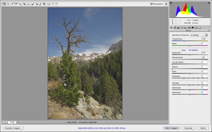 A la pestanya Básico  de ACR s’ha fixat la temperatura de color a 5500ºK tot comprovant amb el comptagotes de Muestras de color que els colors neutres del tronc de l’arbre mort i la neu mantenen una composició RGB prou similar com per no delatar una dominant cromàtica no desitjada. Aquestes comprovacions son especialment importants en espais oberts i assolellats on els reflexes del cel blau poden inundar de dominant blava sobre tot les àrees en ombre. La resta d’ajustatges s’han deixat a cero amb excepció del Recuperación, que s’ha pujat fins el 100% (fins que desapareixen les indicacions de píxels marcats en vermell). A les dues corbes de la pestanya Curva de tonos s’hi ha aplicat un mapa de transició de luminància lineal (“corba” en forma de recta de 45º) per tal de no alterar ni el contrast ni la informació de color. Aquestes corbes es poden editar sempre que l’afectació sigui general o no gaire complicada de personalitzar amb la Herramienta de ajuste de destino. Si, com és el cas, és previsible que les diferents àrees de la imatge necessitaran ajustatges de contrast diferents, prefereixo no tocar res a ACR i treballar a Photoshop amb capes i màscares.