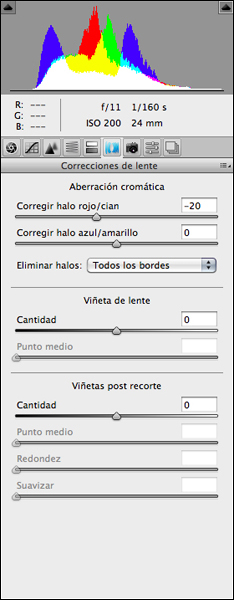 Finalment, a la pestanya Corrección de lente hi he ajustat el valor -20 al cursor de les vores rojo/cian i seleccionat el desplegable Todos los bordes per la correcció de l’aberració cromàtica lateral (TCA) de l’objectiu. Aquesta és la millor combinació que he trobat per la imatge en qüestió. Les comprovacions les porto a terme amb un parell de Muestras de color sobre els voravius acolorits d’un objecte contrastat i disposat tangencialment respecte del camp a les vores de la imatge (vores de les branques de l’arbre mort a l’esquerra de la imatge). La taxa de TCA present en els imatges dels objectius no varia amb el diafragma però és funció de la distància d’enfocament; no es pot, per tant, ajustar un valor de correcció fixe per cada òptica i cal corregir-ho de forma particular per cada imatge. Les bases de dades del filtre Corrección de lente son una opció a considerar encara que atenent a les característiques de la TCA, no he pogut encara obtenir millors resultats que amb l’eina de ACR (més feina per a un millor resultat, … que hi farem!).