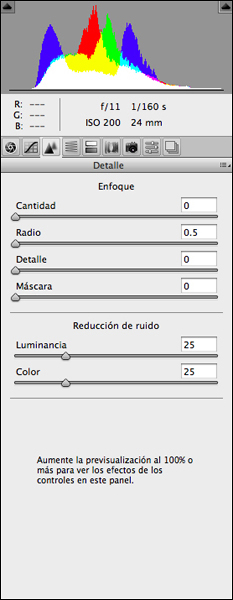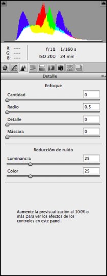 La pestanya Detalle mostra com no aplico cap mena de millora de visibilitat de vores (màscara d’enfocament) doncs treballs realitzats al Laboratori de Qualitat de la Imatge (LQI) del CITM de la UPC, demostren que aquesta eina és força agressiva amb la imatge i no permet regular amb facilitat les àrees on es necessita una millora de visibilitat de vores. Aquest tema es tractarà més endavant al final del processament. A la mateixa pestanya s’han regulat a 25 els ajustatges de Luminancia i Color de la secció Reducción de ruido; les xifres son fruit de comprovacions de comportament d’aquesta combinació de càmera i objectiu en aquest tipus d’il·luminacions pel que fa al soroll. Per tant, no son extrapolables a d’altres instruments i en d’altres condicions de presa.