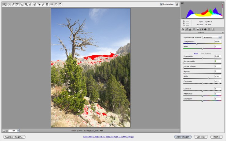 Com és natural i tenint en compte el poc espai que les altes llums de l’escena (boires blanques) ocupen a l’enquadrament, l’automatisme dels ajustatges per defecte de ACR, dissenyat per donar a la imatge un bon contrast i saturació de color, satura aquestes altes llums tal i com indiquen les àrees en vermell i el desplaçament excessivament a la dreta de l’histograma.