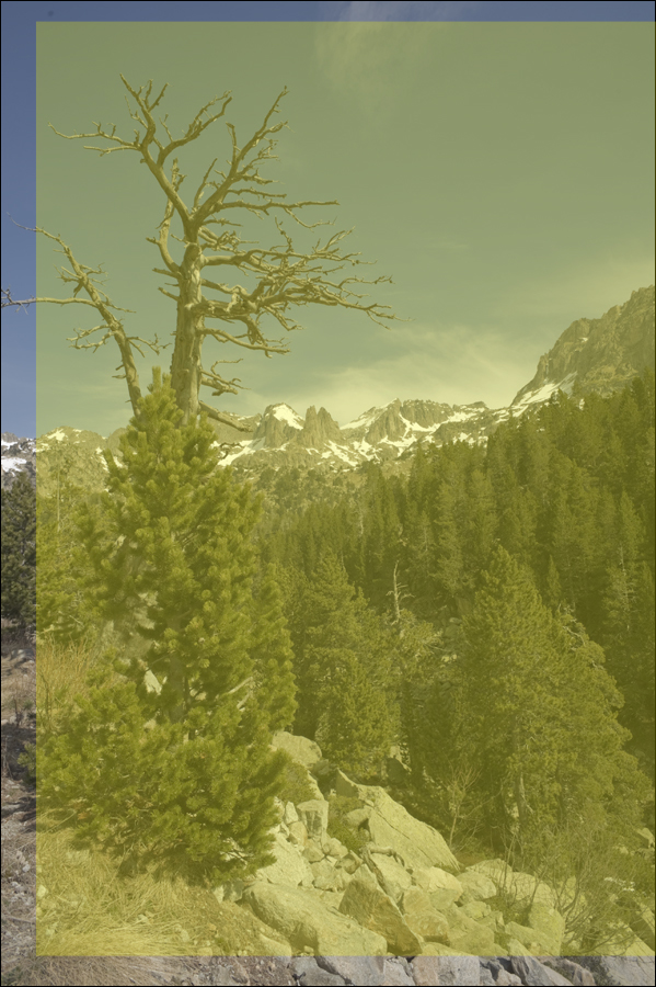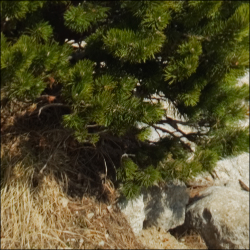 • L’enquadrament inclou primers termes força propers a la càmera i prou importants en la composició, com el pi jove. En aquestes condicions i per aquestes parts de la imatge, una petita trepidació de la càmera provocarà una velocitat relativa de desplaçament de la imatge sobre el sensor durant el temps d’exposició que pot fer ràpidament visible el problema en forma de dobles perfils a les vores més contrastades.