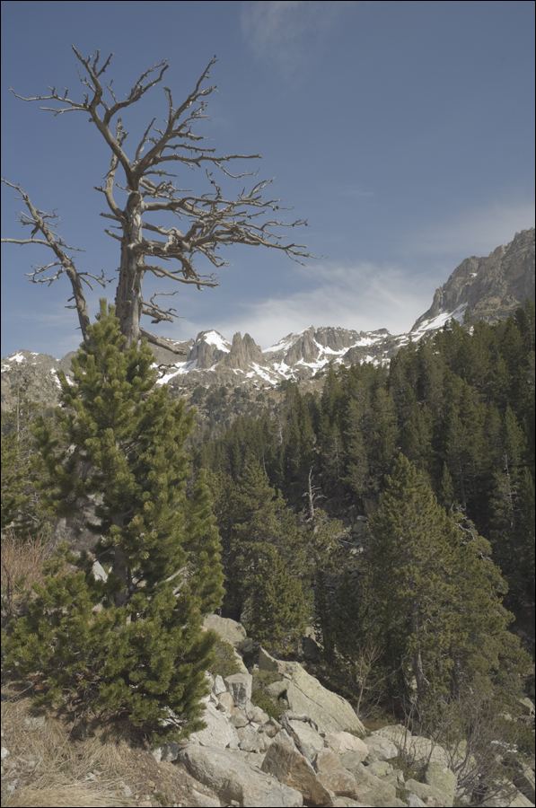L’enquadrament pretén mostrar el cicle de regeneració de l’hàbitat, representat per el pi jove davant del pi mort, tot emmarcant les Agulles d’Amitges, distants al fons del paisatge, enmig de la depressió de la línia límit del bosc a sota i les branques del pi mort a sobre. La idea sorgeix del fet que les agulles son clarament visibles per sobre de l’horitzó amb les boires blanques al darrera i la neu de l’entorn ajuda a definir el relleu de la regió des d’aquest punt de vista força llunyà.