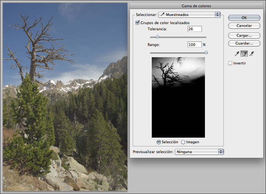 Amb l’enquadrament definitiu i algun arranjament amb el Tampón de Clonar i la Herramienta Parche, considero les necessitats de millora del contrast. Per tal de no estar condicionat per diferències de criteri o operativitat, selecciono el cel amb Selección>Gama de colores… i el guardo com a un nou canal; aquesta selecció em permetrà seleccionar també el paisatge sense el cel, simplement carregant la selecció del cel i fent la inversa.
