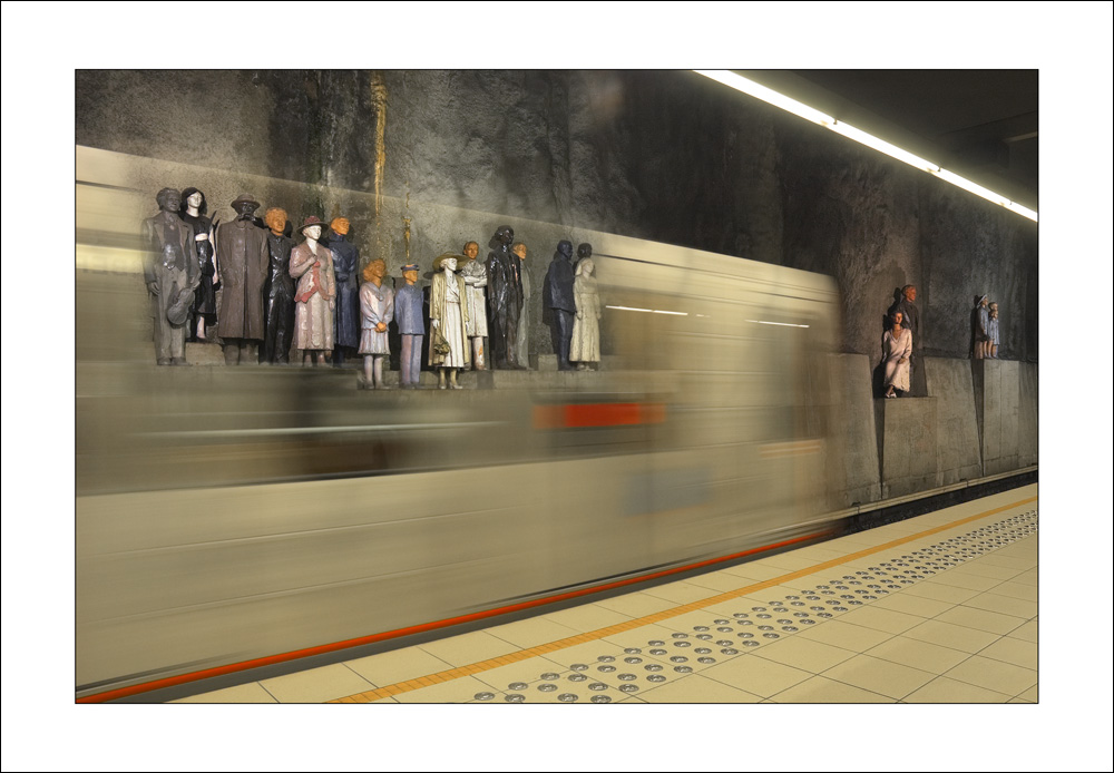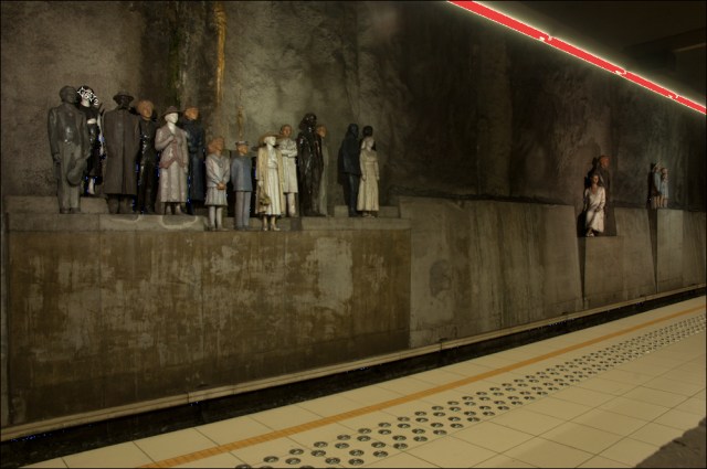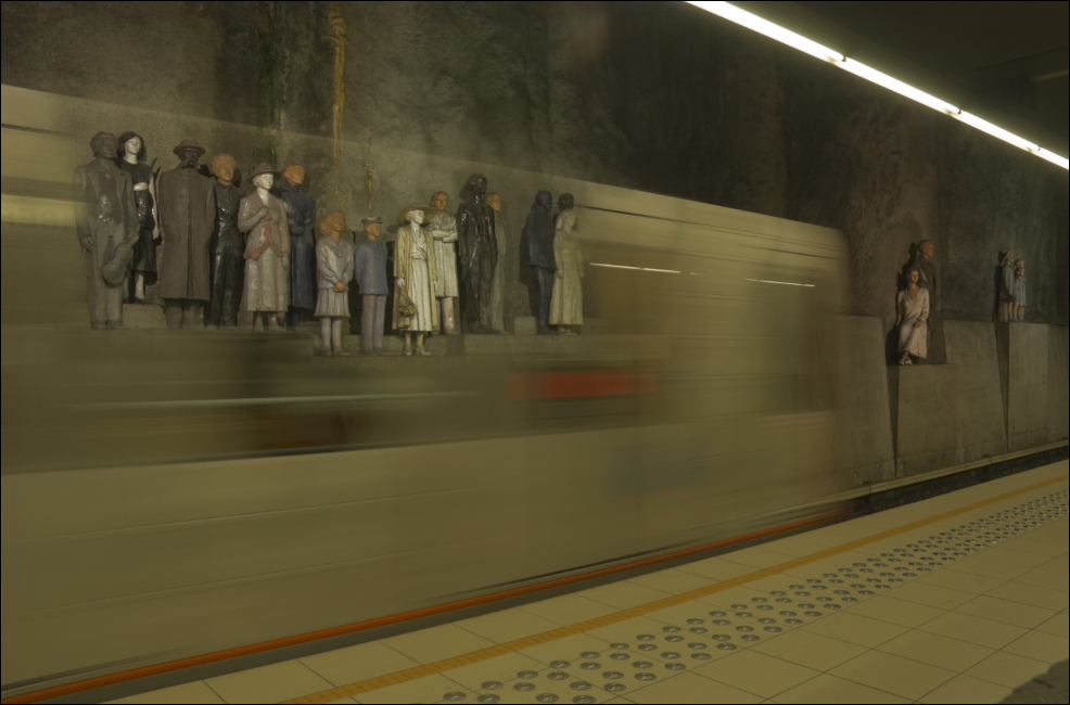 El pasado año, durante una estancia en Bruselas, viajé en el metro de la ciudad y en la estación de Stuyvenbergh me encontré con unas estatuas adosadas a las paredes de la estación. El tamaño, el color y la posición de las mismas me llamaron la atención y obviamente, me dispuse a tomar unas imágenes. En primer lugar me dediqué a observar de forma aislada los diferentes grupos de estatuas; el problema es que la imagen que me daba vueltas en la cabeza era una que mostrara las estatuas y su ubicación en una estación de metro sin necesidad de explicar nada y estas imágenes no reflejaban esta idea.