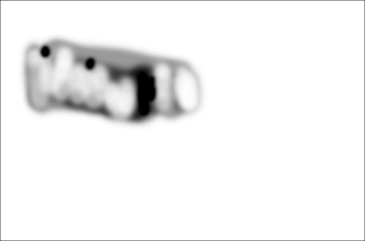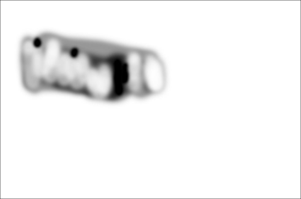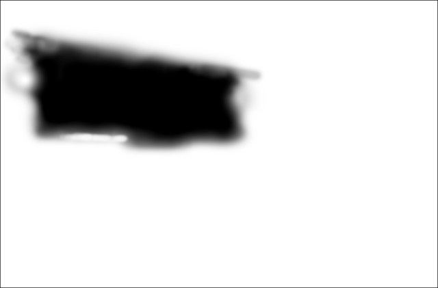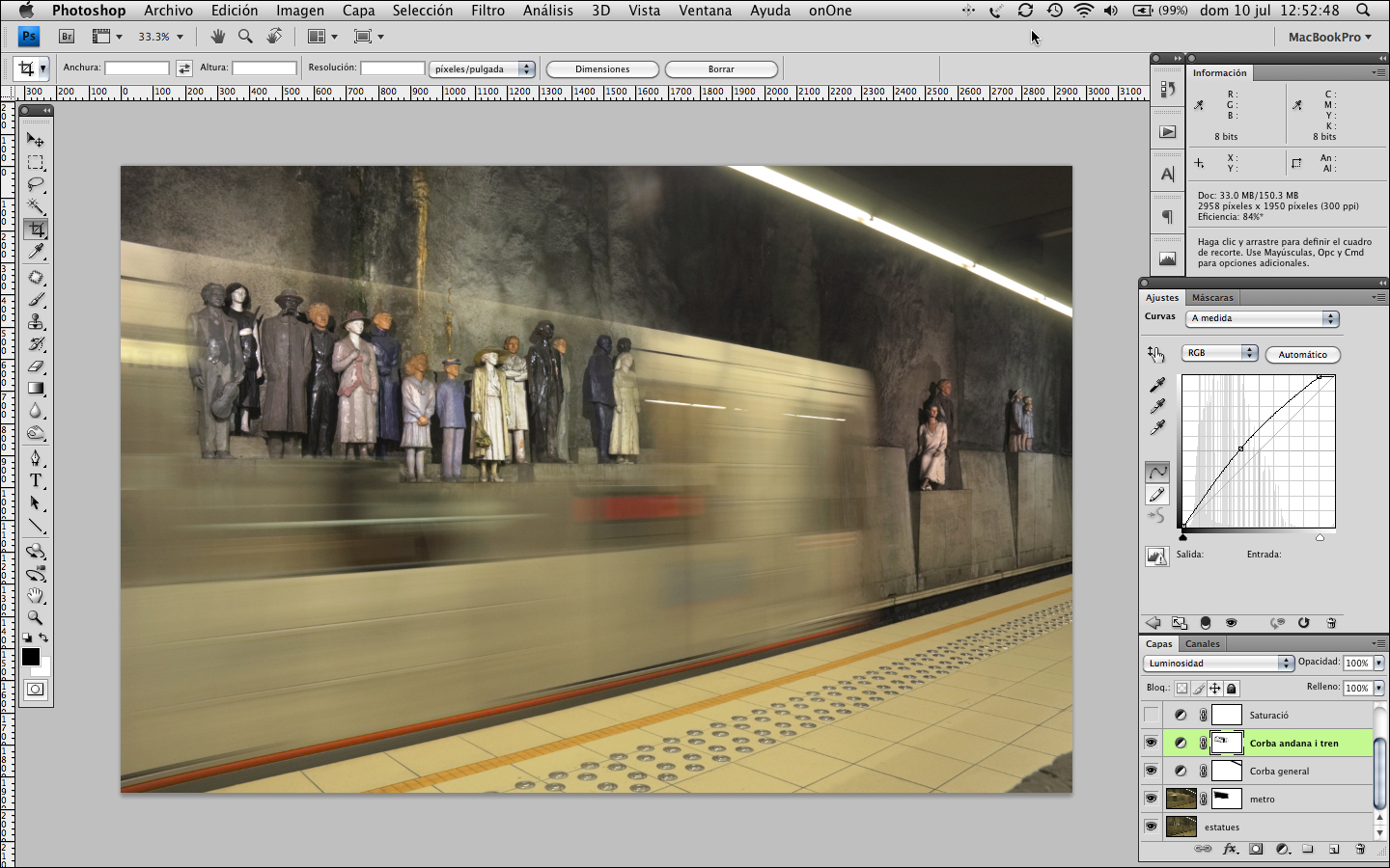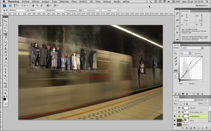 A partir de estos ajustes, se procesan de la misma forma las dos imágenes tomadas, se abren en Adobe Photoshop y se juntan como capas de un mismo archivo. Dado que la imagen es de bajo contraste y es previsible tener que proceder a una expansión del histograma para aumentar el contraste, al menos en las zonas en que se considere adecuado, se procesan los archivos raw a 16bit de salida para evitar problemas de posterización posteriores (histograma en “peine”). En este caso se coloca la imagen de las estatuas en la capa inferior y la del tren en la superior. Con una máscara de capa se procede a la mezcla manual de las partes correspondientes a cada imagen. Aquí cada cual puede tener su propia opinión respecto de lo que es más adecuado o interesante. La máscara utilizada y el resultado de la mezcla se muestran a continuación:
