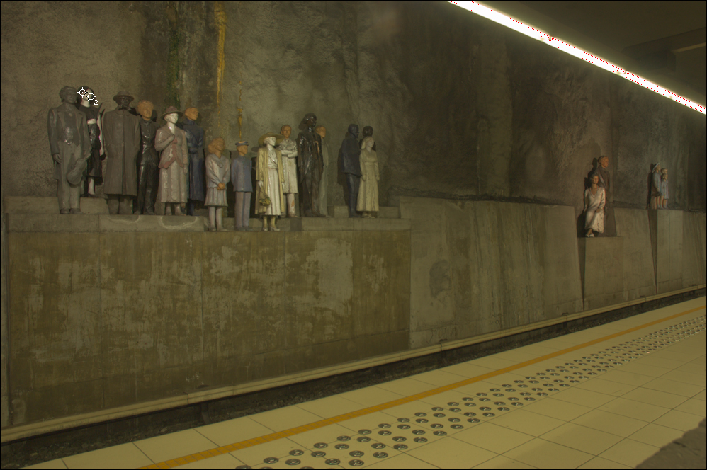 Aunque a los ojos del espectador, el andén del metro no parece una escena muy contrastada, en el sentido fotométrico lo es. Con la cámara utilizada, la medición en modo matricial tiende a sub-exponer la toma. Éste es, por lo tanto, otro aspecto a considerar en el procesado del raw. En la parte inferior se muestra el aspecto de la imagen de la toma de las estatuas con el procesado por defecto de Adobe Camera Raw (ACR).