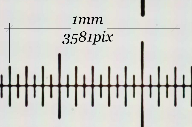 1. El reticle de calibratge que es mostra a la Figura 2 no te la mida en píxels de la imatge original presa amb la càmera. Només és al post com mostra del procediment seguit. Les ratlles mitjanes del reticle son dècimes de milímetre. Comptant el nombre de pixels que ocupen a la imatge original (no a la que es mostra al blog) i relacionant aquesta mida amb la mida coneguda dels fotorreceptors de la càmera (0.0085mm), calculeml’augment efectiu de la presa.