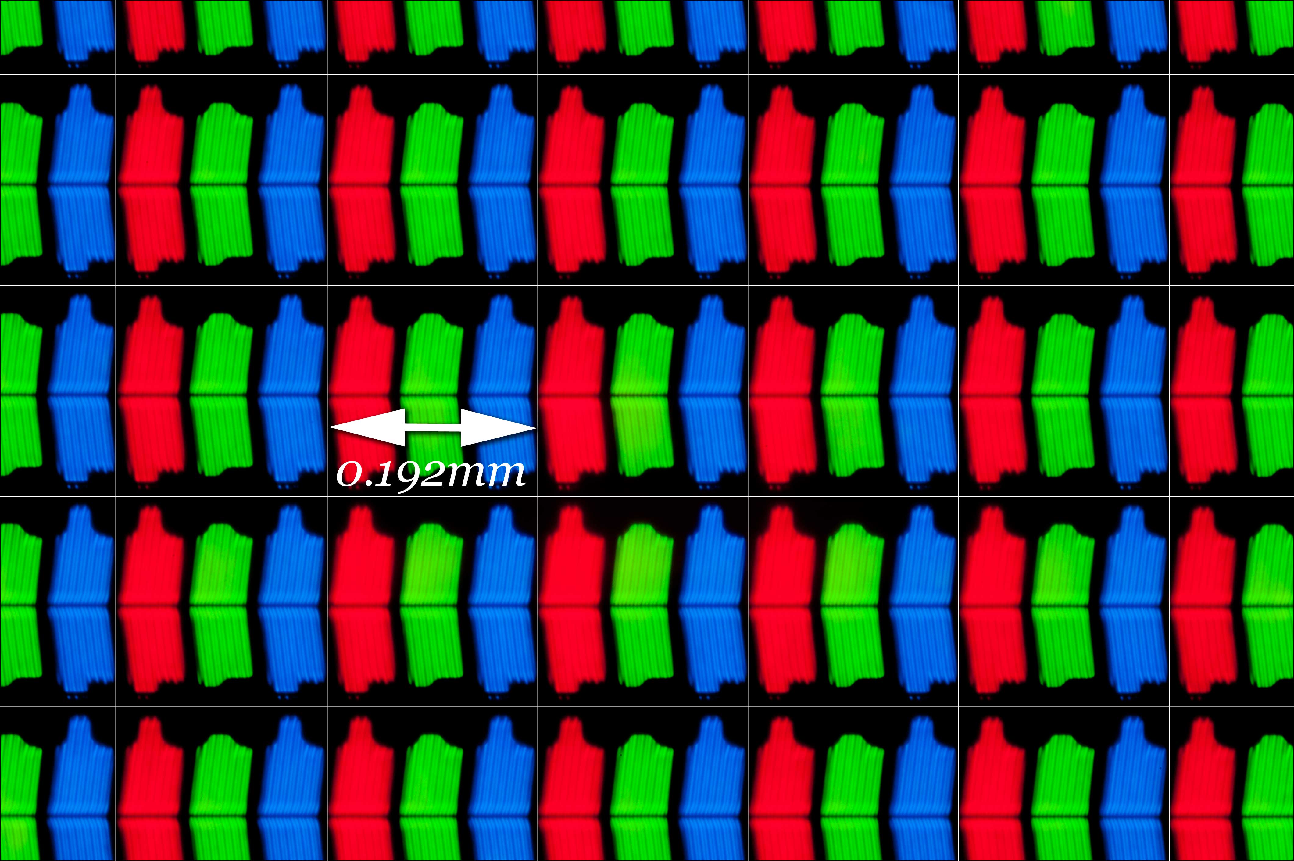 Figura 1. A la imagen de los píxeles del iPad2 se le ha añadido una parrilla para facilitar la localización de los diferentes píxeles visibles y sus correspondientes regiones sub-píxel RGB. En uno de los píxeles se indica su tamaño en milímetros. Este tamaño se ha calculado mediante la imagen de una retícula calibrada que se tomó en la misma sesión y al mismo aumento de m = 30.
