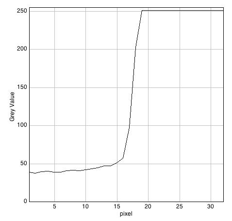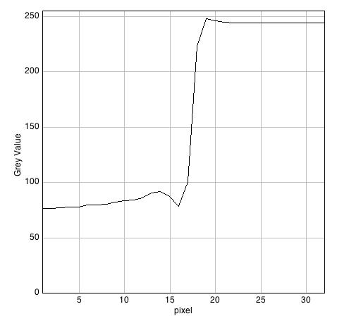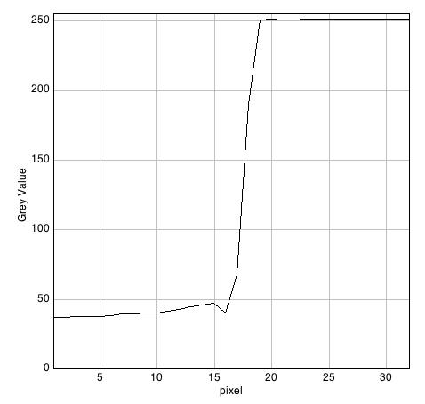 Los bordes de los archivos obtenidos en formato TIFF con el programa 645PRO no se muestran porque son idénticos a los del formato JPEG proporcionados por el mismo programa. De las tres parejas de trazados de valor de gris de los píxeles de los correspondientes bordes se deducen que algunas de las diferencia sentre los diversos modos de captación probados, lo que en realidad hacen es aplicar mejoras de nitidez con criterios diferentes: