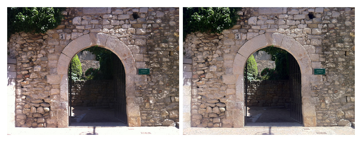 En las imágenes de la Figura 9 se compara el rango de valores tonales obtenido en los modos Normal y HDR de la cámara original del iPhone4. Observar la diferencia de información en la parte en sombra del interior del arco y la textura del empedrado del suelo frente a la puerta.