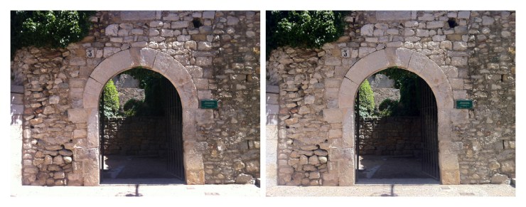 Figura 9. A la izquierda, imagen obtenida en el modo JPEG por defecto de la cámara del iPhone4. A la derecha, la misma imagen procesada por el software del instrumento en el modo HDR. Resulta evidente la mejora de la información textural en el pavimento empedrado frente a la puerta y el muro de la izquierda así como, en menor medida, en la zona en sombra del interior del recinto (haciendo click sobre la imagen se puede observar una versión de mayor tamaño para mejorar la comparación).