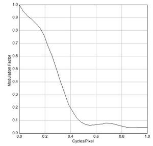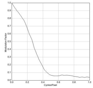 Figura 3. A la izquierda, medida horizontal (filas) de la MTF del archivo TIFF obtenido mediante el programa 645PRO. A la derecha, misma medida en sentido vertical (columnas).