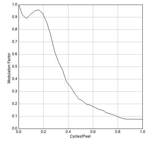 - El resultado obtenido a partir del archivo JPEG captado en el modo HDR del iPhone4 (Figura 5) presenta un perfil de curva alterado en las frecuencias bajas y anormalmente alto en las frecuencias altas. Ello puede ser consecuencia de una aplicación agresiva de algoritmos de mejora de bordes.
