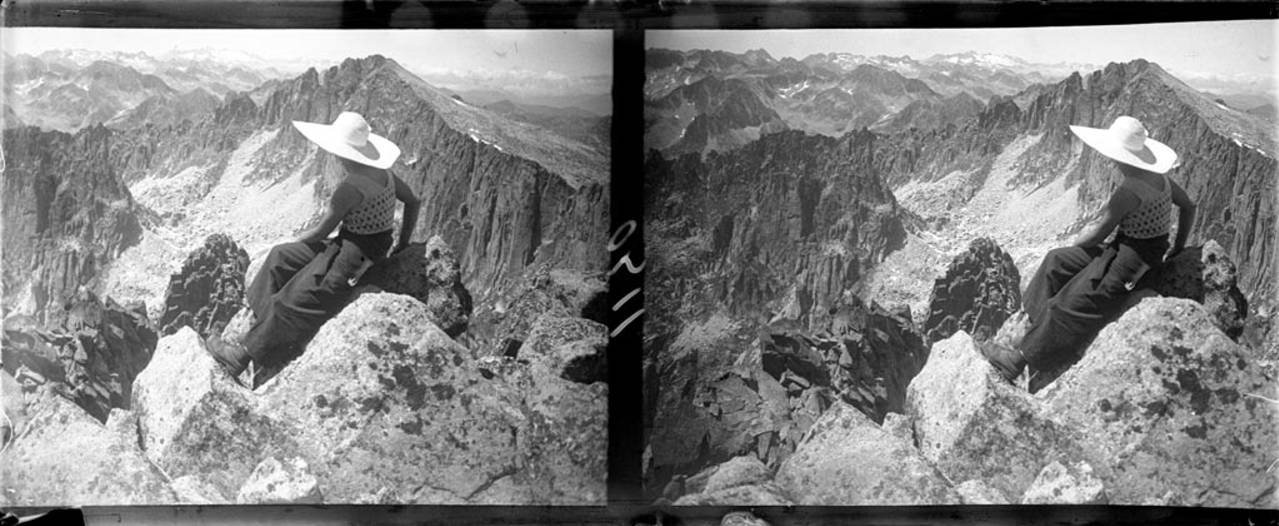Una de las imágenes, ya digitalizada por el personal de l’Arxiu Fotogràfic del Centre Excursionista de Catalunya (AFCEC), llegó con el nombre de archivo <AFCEC_ORFILA_X_074> (Figura 1). En ella aparece una excursionista sentada, de espaldas a la cámara, sobre una roca de una cima sin identificar. La imagen, con una composición clásica, es un excelente ejemplo de como la disposición de los elementos en la composición puede mejorar sustancialmente la observación del par estereoscópico y la sensación de profundidad.