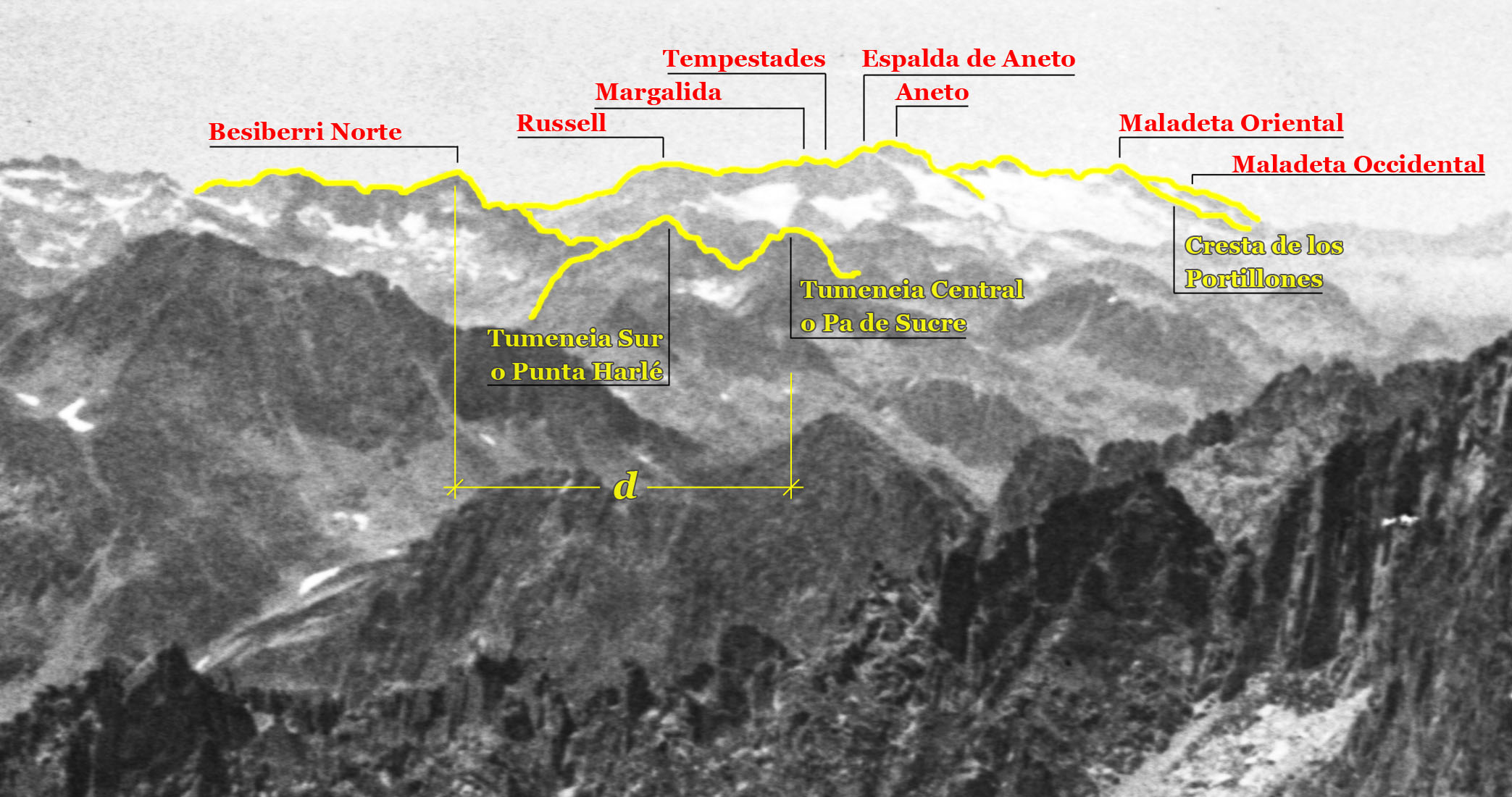 Figura 2. Sección ampliada de la parte superior central de la imagen de la Figura 1, con indicación de las principales cimas y la distancia “d” entre la cima del Besiberri Norte y el Pa de Sucre; (hacer click para ver una versión mayor de la imagen).