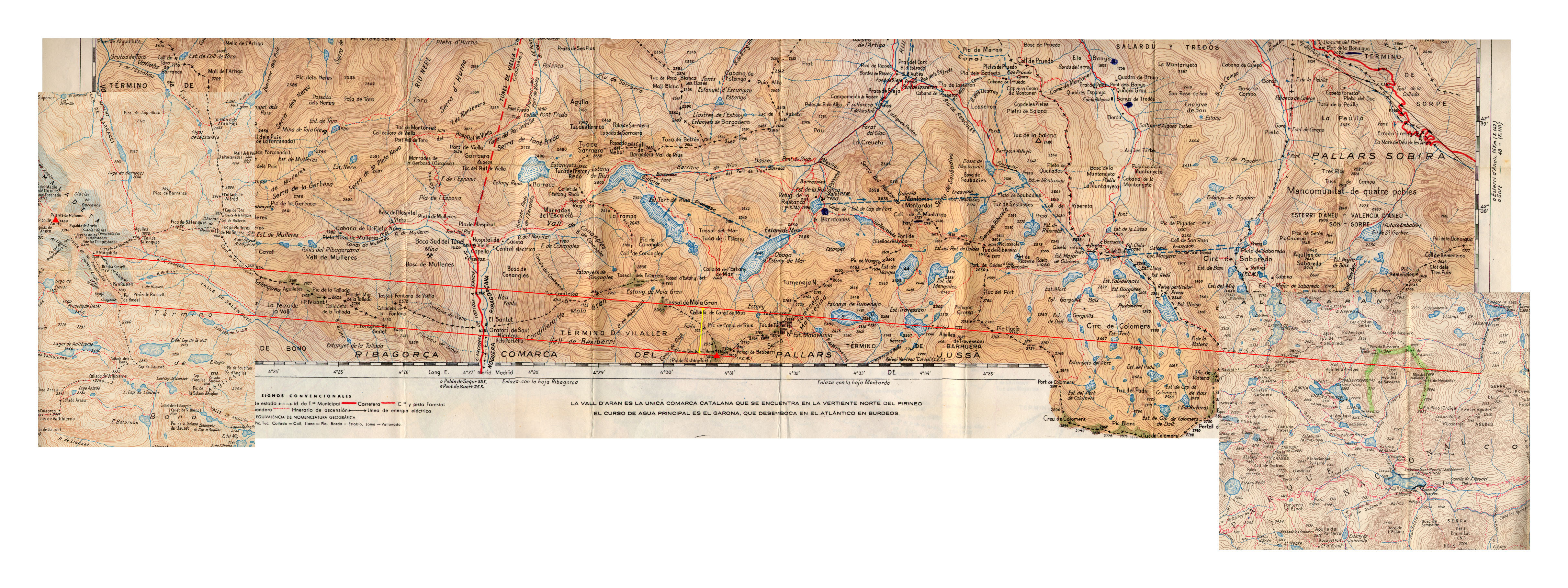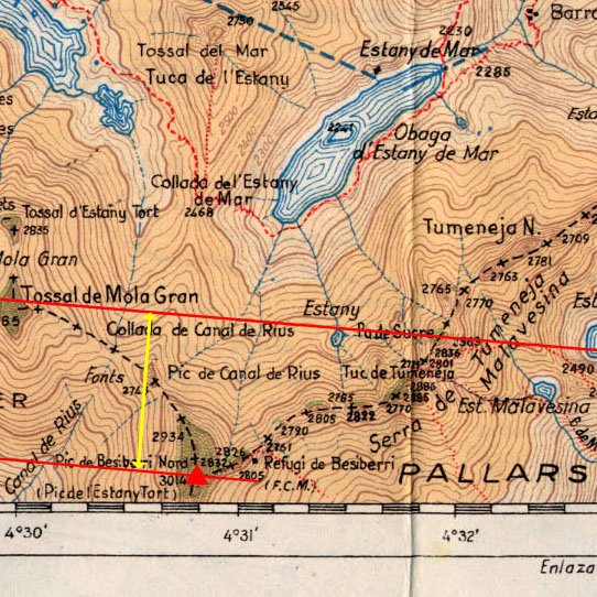 - Trazado de la visual principal sobre un mapa. Ésta trancurre por el centro de la imagen a lo largo de una línea que une la cima del Tumeneia Central o Pa de Sucre con una zona indeterminada de la divisoria de aguas del fondo y que se puede aproximar como el Pico de Margalida. Esta intersección se deduce de la obstrucción visual que se aprecia en la fotografía.