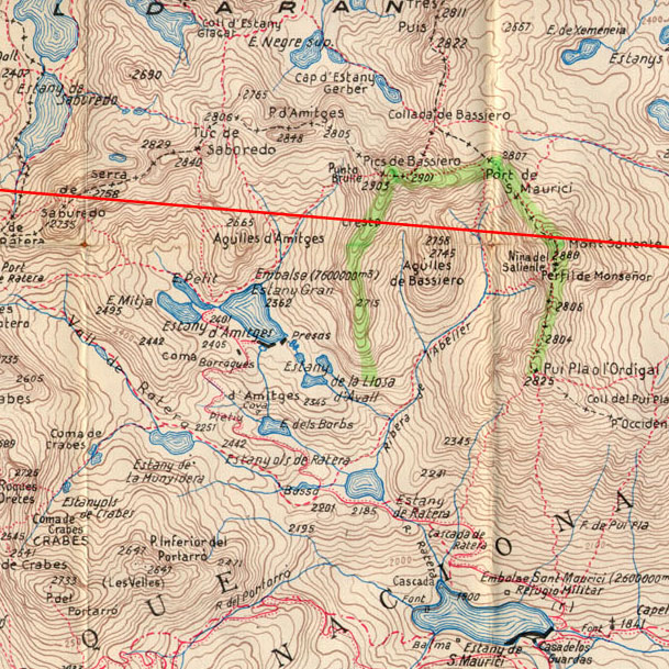 Figura 4. Detalle del mapa a escala 1:40.000 que muestra la medición de la distancia de separación entre las cimas del Besiberri N y el Pa de Sucre.