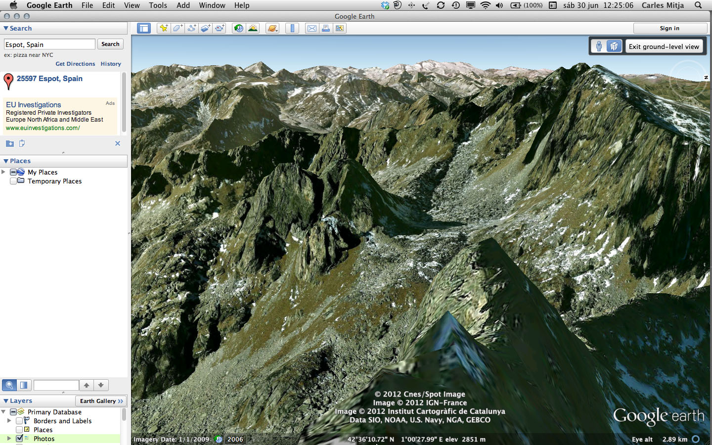 Figura 6. Visión del terreno proporcionada por el programa Google Earth situando un observador en la cima del Mont Saliente; (hacer click para ver una versión mayor de la imagen).