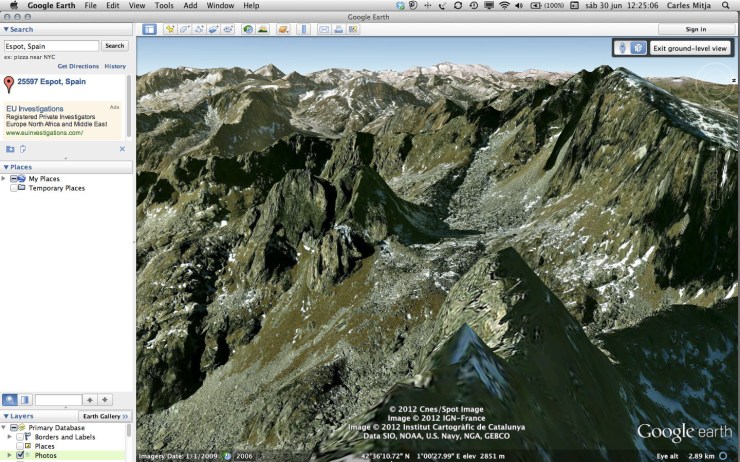 Dejando pendiente una ascensión al Mont Saliente para cuando se presente la oportunidad, podemos mientras tanto hacer uso de la tecnologías de la información y la comunicación (TIC) que nos permiten disponer de información cartográfica basada en imágenes reales tomadas desde satélite. Esta información y su carácter de imágenes de la realidad, no representaciones, permite diversas proyecciones del terreno basadas en la transformación de la visión cenital de la cámara del satélite y el aprovechamiento de la textura de la imagen para recubrir la representación volumétrica de la orografía generada virtualmente. Google Earth es una posibilidad accesible desde cualquier ordenador conectado a Internet. Si se localiza el Mont Saliente en el entorno del Parque Nacional de Aigüestortes i Llac de Sant Maurici y se posiciona un observador sobre la cima en la visión a nivel del terreno, se obtiene el resultado de la Figura 6.