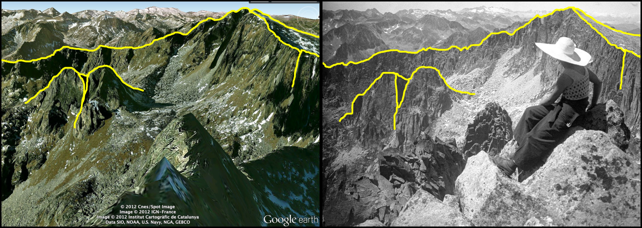 Figura 7. Comparación entre la imagen original, a la derecha, y la obtenida de la proyección de Google Earth situando el observador en la cima del Mont Saliente. En amarillo se han resaltado la Cresta S y cima de Bassiero así como el perfil de las Agulles de Bassiero en el centro del circo; (hacer click para ver una versión mayor de la imagen).