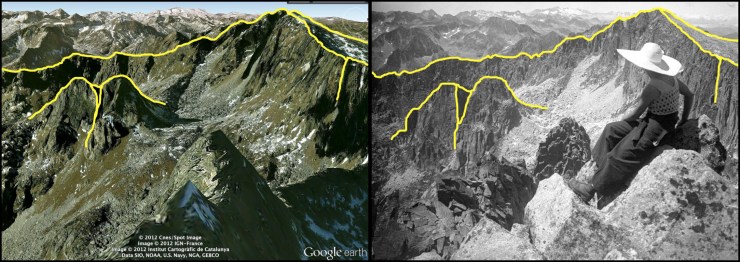Como puede observarse en la comparación de la Figura 7, el panorama de montañas es exactamente el mismo que el presente en la imagen analizada que se tomó, según la información del AFCEC, en 1934. Aunque el grado de acierto, en este caso, se basa tanto en un cierto conocimiento de la orografía pirenaica, de una aproximación a los datos de cámara desconocidos y de la posibilidad de determinar distancias entre objetos conocidos en la escena, no es menos cierto que estas posibilidades se fundamentan también en la relativa facilidad con la que las mediciones necesarias se pueden tomar del carácter discreto de las imágenes digitales. Por último, un buen ejemplo de las posibilidades de las que disponemos hoy lo constituye la comprobación final en Google Earth.