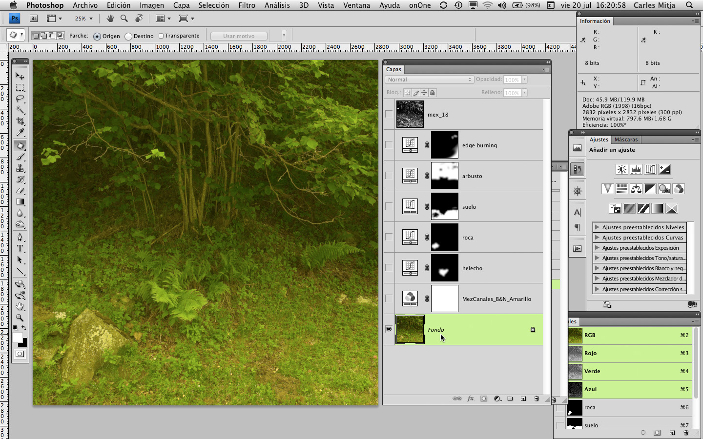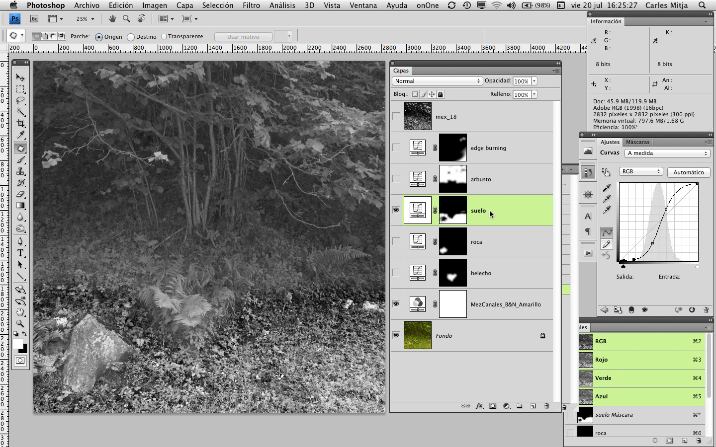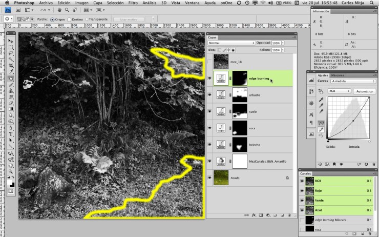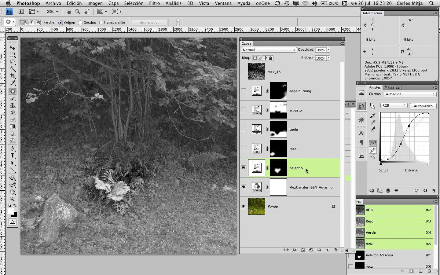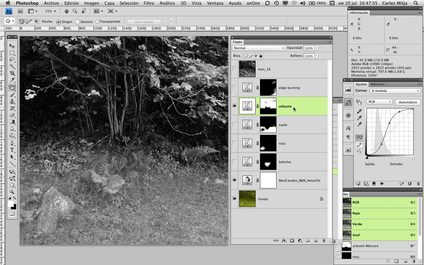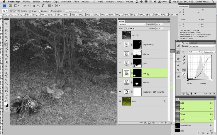 Como se observa en las imágenes de las Figuras 3 a 6, las modificaciones del contraste local se aplican según un criterio subjetivo, tal y como corresponde a una imagen de autor y por lo tanto, de libre interpretación. Estas modificaciones, aplicadas mediante capas de ajuste de Curvas, permiten el replanteamiento a medida que se avanza en el proceso. Ello es de suma importancia dado que al modificar un elemento, su peso en la composición cambia y puede provocar la necesidad de modificar otro. No es lo mismo considerar el contraste del helecho por separado que una vez ya se ha modificado el contraste de toda la imagen. No es raro pues, tener que modificar ligeramente el contraste de las partes de la imagen que se han procesado en primer lugar, una vez se tiene una visión de conjunto al final del proceso.