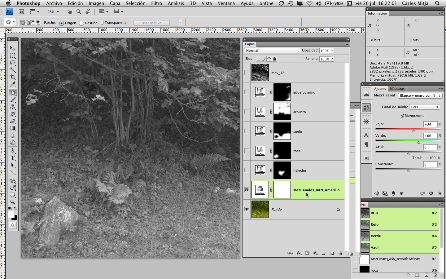 Figura 2. Conversión a blanco y negro mediante una Capa de Ajuste “Mezclador de Canales” en el modo “Blanco y negro filtro amarillo” (Hacer click sobre la imagen para ver una versión mayor).