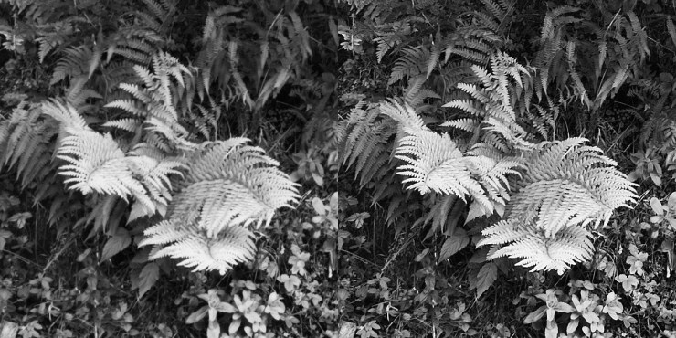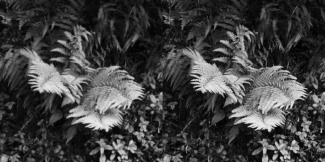 Figura 8. Comparación entre la zona de la imagen correspondiente al helecho antes (izquierda) y después (derecha) de la aplicación del filtro de mejora de visibilidad de bordes (Hacer click sobre la imagen para ver una versión mayor).