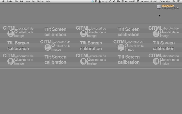 En la Figura 1 se muestra el sistema de calibrado que utilizo en mi MacBook Pro de 15″ para determinar la inclinación de la pantalla en relación a mi posición. Cuando la fila de texto central tiende a desaparecer confundiéndose con el fondo, la pantalla está en la inclinación correcta para la posición del observador. El sistema funciona razonablemente bien y los resultados de edición de imagen adquieren consistencia a través del tiempo. De todas formas, exige ser escrupuloso con el cambio de inclinación cada vez que se cambie de posición. Nada mejor que una segunda pantalla de calidad que permita cambios del ángulo de observación de al menos 45º derecha-izquierda y arriba-abajo. Pero cuando se está con el portátil en una habitación de hotel, en una silla incómoda, frente a una mesita de cara a la pared y después de una larga jornada de trabajo es mejor el calibrador de inclinación que nada.