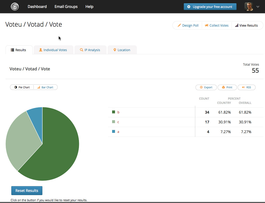 El 61,82% dels 55 vots emesos es decanta per la opció (b), essent doncs la clara guanyadora. Un 30,91% decideix que la millor opció és la (c) mentre que només un testimonial 7,27% tria la opció (a). Més avall, els comentaris.