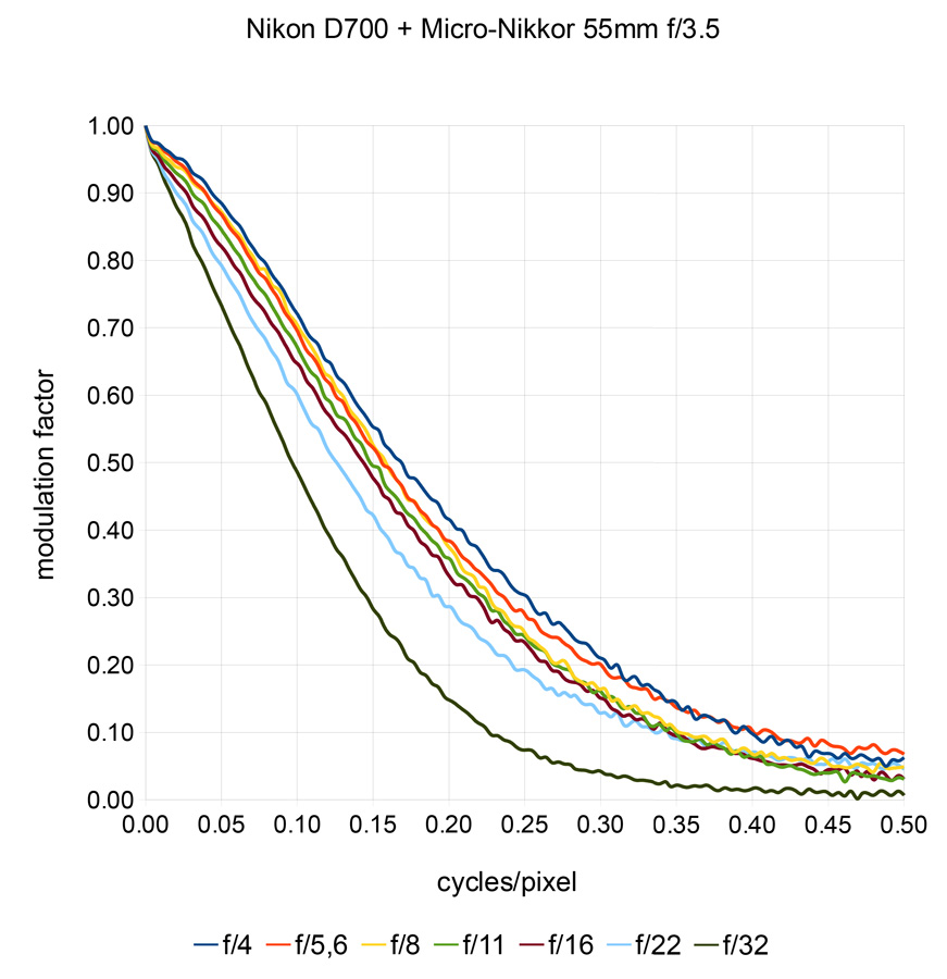 - Si la cámara equipa filtro anti-aliasing (LPF por Low Pass Filter) como es el caso de la D800, no existe riesgo de moiré causado por el aliasing y por lo tanto se puede elegir cualquier valor de diafragma siempre que el mismo no condicione la resolución del sensor. En la Figura 2 se muestra el conjunto de MTF de un objetivo Micro-Nikkor 55mm f/3.5 para todas las aberturas de diafragma desde f/4 hasta f/32, extraídas de un ensayo con un aberrómetro de Hartmann-Shack. De ellas se deduce que con esta cámara el diafragma f/16 es el primero que condiciona la resolución del sensor. Mientras el objetivo, a f/16, está limitado a 85lp/mm (pares de líneas por milímetro), el sensor podría registrar 102lp/mm. El límite de uso está pues en f/11 con una resolución en el objetivo de 115lp/mm, cifra que no limita las posibilidades del sensor. Aún así, según la Tabla 1 el tamaño de la mancha de la difracción ya es demasiado grande a f/11 en relación al tamaño de los foto-receptores y el límite debería establecerse en f/8. Este diafragma producirá la mejor calidad de imagen con este cuerpo de cámara y este objetivo en las condiciones de trabajo descritas. Con esta cámara y dicha situación, las aberturas de f/16, f/22 y f/32 no sólo causan degradación de la imagen por difracción sino que limitan claramente la resolución del sensor. Ello implica que no se aprovecha dicha resolución y que hay detalles capaces de ser registrados por la cámara que no estarán presentes en la imagen ya que el objetivo no los resolvió.