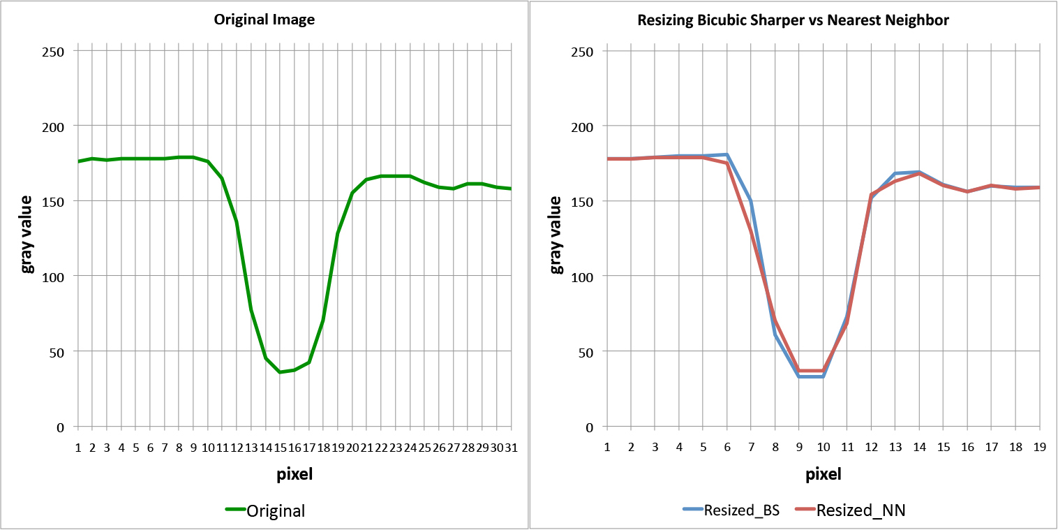 Figura 3. Gráficos de valor de gris de píxel de las selecciones mostradas en la Fig. 2. A la izquierda, imagen original; a la derecha, reducciones del tamaño de imagen mediante los algoritmos Bicubic Sharper y Nearest Neighbor (click en la imagen para observar una versión ampliada).
