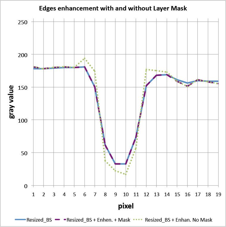 En la Fig. 3 se muestran los gráficos de valor de gris de píxel de las selecciones de la Fig. 2. Como puede observarse, tanto uno como el otro algoritmo introducen una mejora clara de la visibilidad de los bordes. Dado que ninguno de los dos introduce halos blancos en la posición del borde, se escogerá el Bicubic Sharper (Bicúbico más enfocado) ya que la mejora con éste es la más evidente.