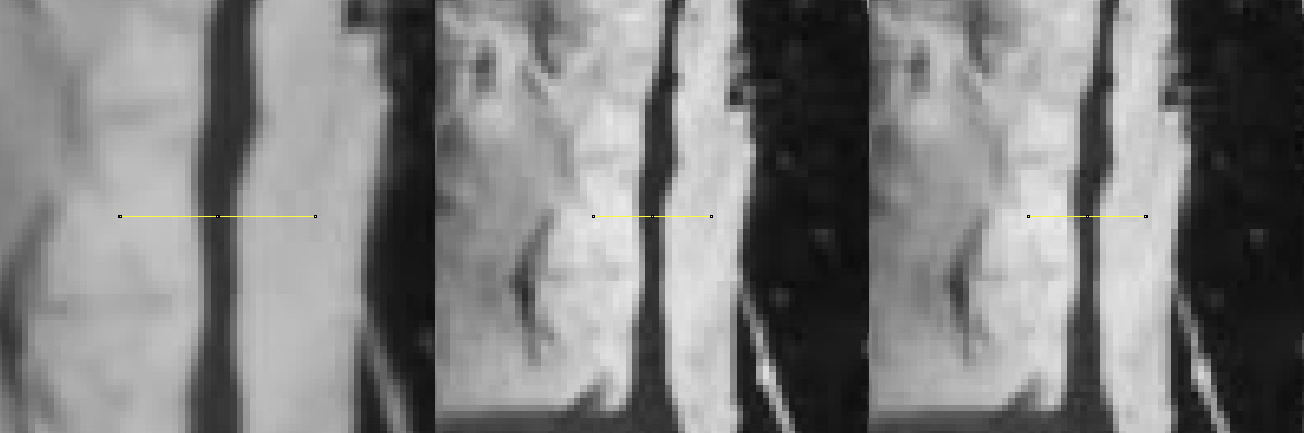 En la Fig. 2 de muestran las respectivas selecciones de valor de gris de píxel. En ella puede observarse como una misma característica de la imagen ocupa menos píxeles después de la reducción de tamaño y como la nitidez de bordes es algo mejor en las versiones reducidas, en el centro y a la derecha.