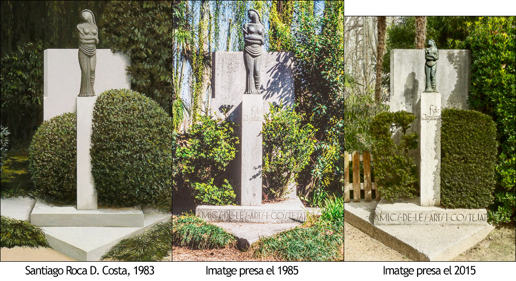 La imatge que vaig prendre del monument el 1985 mostra un enjardinament més descuidat. Hi ha dos elements però, que allunyen la imatge de l’intimisme de Roca D. Costa. Per una banda, l’assolellament, la projecció d’ombres i el color fotogràfic. Per l’altre, un punt de vista més llunyà que distancia l’espectador de l’escultura. Per veure les diferències en les respectives distàncies d’observació, fixeu-vos en les fugues de les lloses de pedra que serveixen de base al monument. És ben clar doncs, que al marge de les necessàries diferències d’il·luminació i enjardinament, al 1985 no vaig saber respectar prou els aspectes formals del quadre que m’havien donat com a guia.