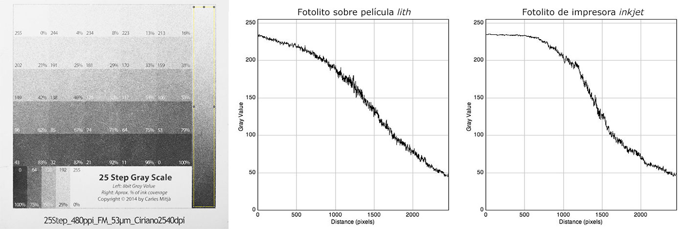 - Figura 3. Comparación entre la escala tonal obtenida con fotolitos sobre película lith (izq.) o impresora inkjet (der.). A la izquierda se indica en amarillo la selección tomada de la reproducción de las estampas para trazar los respectivos gráficos (hacer click sobre la imagen para ver una versión ampliada).