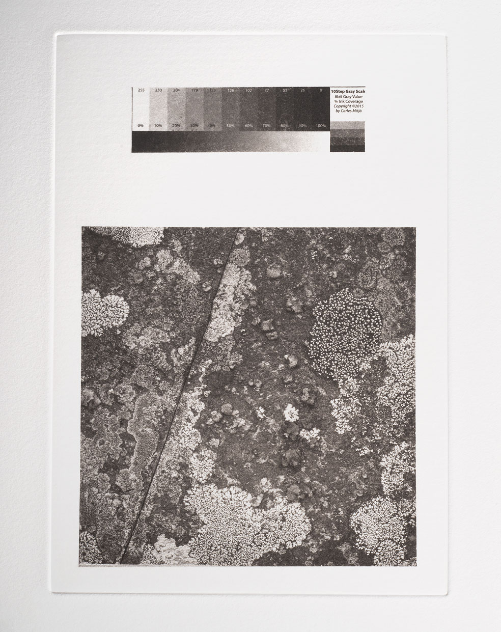 After some troubles and a quantity of trials with Grayscale step wedges, here is my first Heliogravure image. The plate measures 145x165mm and the image 120x120mm. I have used an stochastic screen digitally designed and printed on high contrast photographic film in a Pre-press service bureau. The digital image was edited in Adobe Photoshop and printed on Pictorico OHP film with an EPSON R3000 printer. The etching sequence was 45ºBé, 43ºBé, 42ºBé, 41ºBé and 40ºBé. The etching begun after 5min in the 45ºBé solution and most of tones have been etched between 43ºBé, 42ºBé and 41ºBé. The plate was in the 40ºBé solution only for 1min. The total etching time is of 25min at 21ºC. This a proof with the step wedge still on the upper plate area. Clicking on the image you will see a life size version (only approximate and depending on the size of your screen pixels).