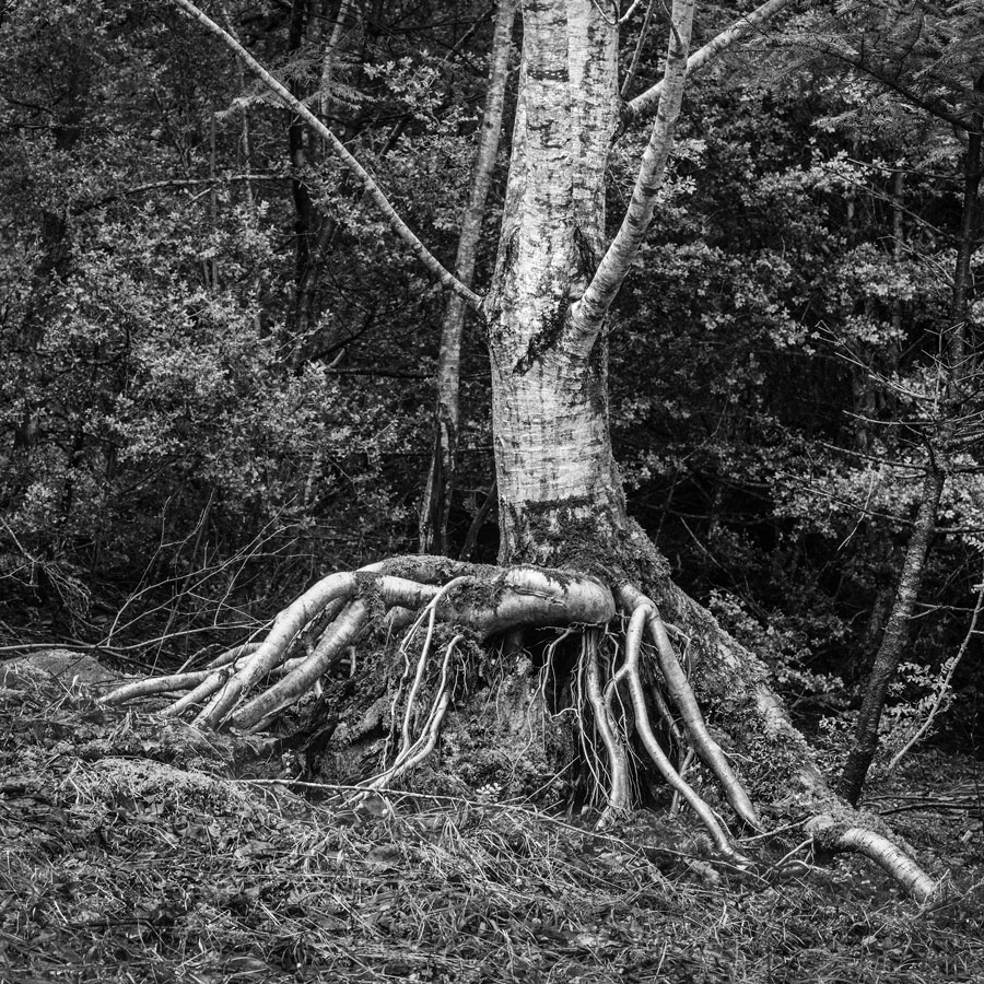 En Abril de 2015, cinco meses después, una nueva visita al Valle de Vallibierna me permitió volver al claro del bosque con el aliso solitario. Teniendo en mente la imagen tomada en Noviembre, esta vez remonté la pendiente hasta el mismo nivel del árbol. Después de algunas indecisiones, el trípode se posicionó de forma que permitiera un punto de vista algo elevado por encima del conjunto de raíces. La cercanía de la cámara al árbol aconsejó en este caso la longitud focal de 35mm. El encuadre era esta vez algo más amplio pensando en al posibilidad de re-encuadrar a voluntad sin llegar al plano cerrado de la imagen de Noviembre. La imagen captada y el recorte aplicado se muestran en la Fig., 2.