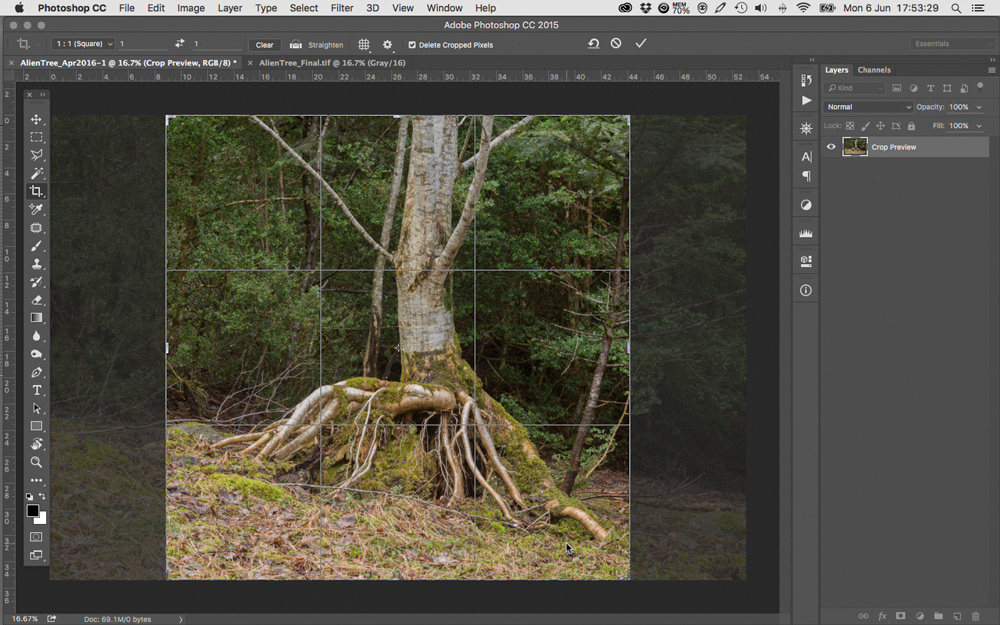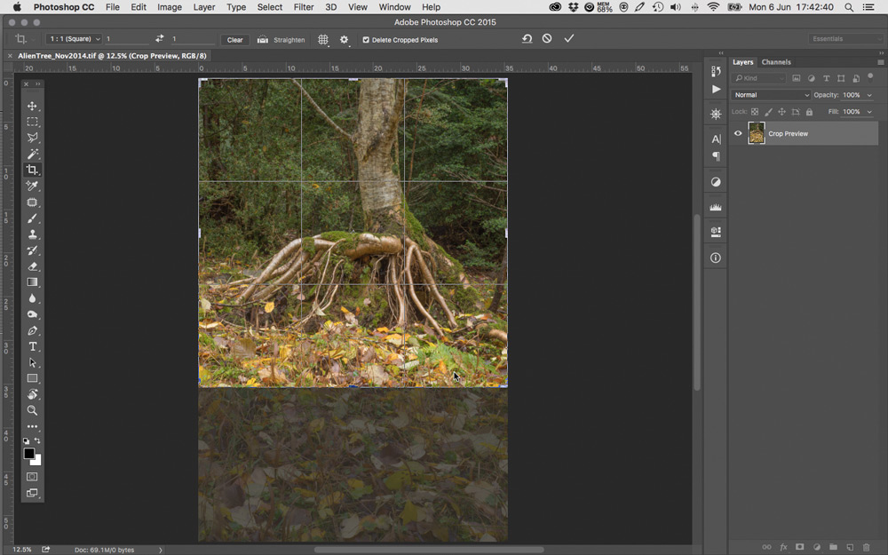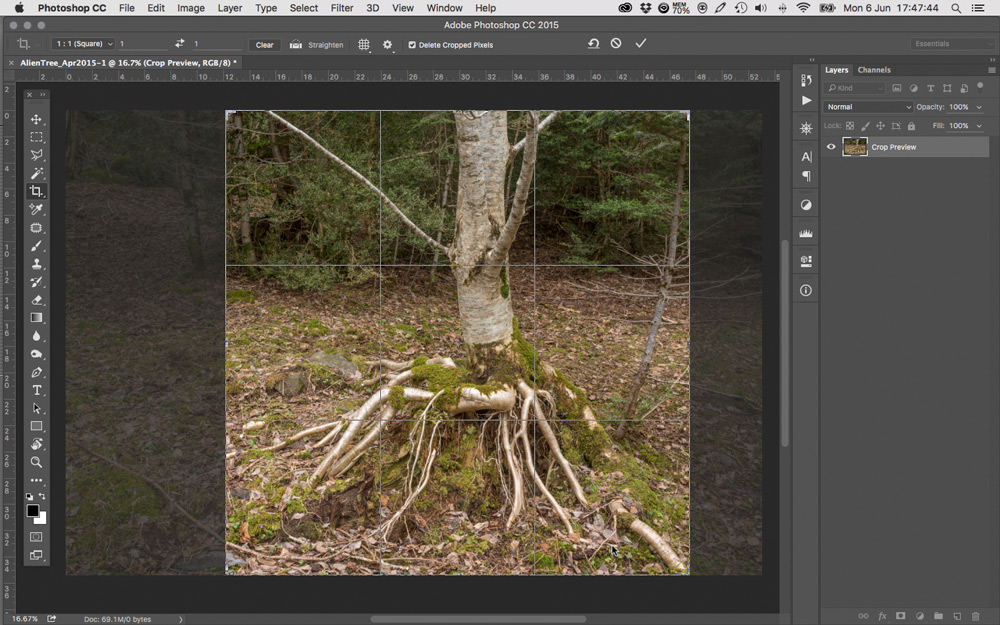 En Noviembre de 2014, paré el coche en el margen de la pista, atravesé el linde del claro y remonté la pendiente hasta una cierta distancia del árbol desde la que me pareció interesante la relación entre la figura y el fondo. Posicioné el trípode a media altura para un encuadre en formato cuadrado aprovechando la parte superior de un fotograma vertical. La idea era resaltar los esfuerzos del árbol por deshacerse de su atadura al terreno. Ésa era mi propuesta y a esa distancia, el objetivo más adecuado entre los disponibles era el 55mm. La imagen obtenida es la que se muestra en la Fig., 1; en la misma figura se aprecia el recorte cuadrado en la parte superior del fotograma.