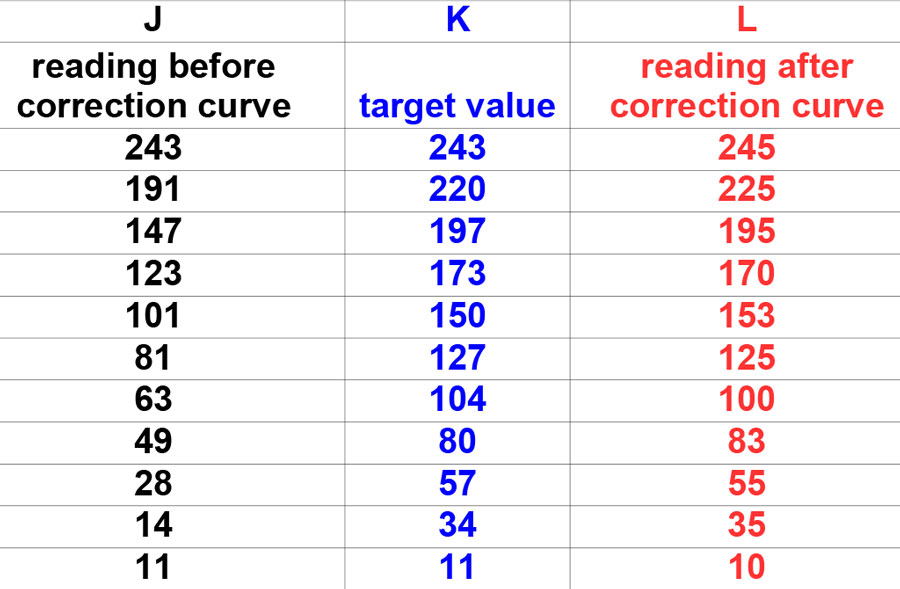The Photoshop correction curve follows from the actual reading values for each step in the printed target. In order to calculate the necessary correction, we can use an spread sheet and create a column with the actual read values in a column (J in Fig., 5) and then use an equation to calculate the corresponding target values (column K in Fig., 5). If we take the example of the calculated target value 220, it is the result to apply the equation =K3-((J$3-J$13)/10) in the cell of the spreadsheet. The procedure to plot the correcting curve can be done in Adobe Photoshop setting the actual and target values in the correspondingly input and output windows of the Curves Tool. This correction curve can be saved with the available commands in Adobe Photoshop and then, applied to all images to be printed as positive transparencies.