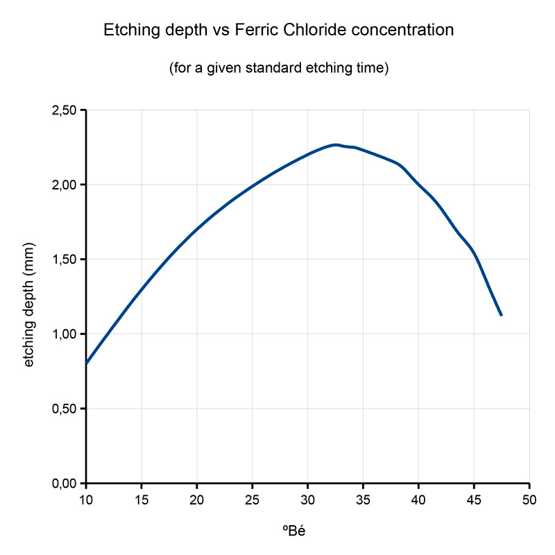 From a text published by H. M. Cartwright in 1961 (1), it can be derived that the etching action of the ferric chloride is highly dependent of its concentration. This indicates that the concentration not only determines its ability to penetrate the gelatin resist, but also acts with a different speed when finally is in contact with the copper. The Fig., 1 shows a plot taken from this text representing the depth achieved by several ferric chloride dilutions on a copper plate for a given time.