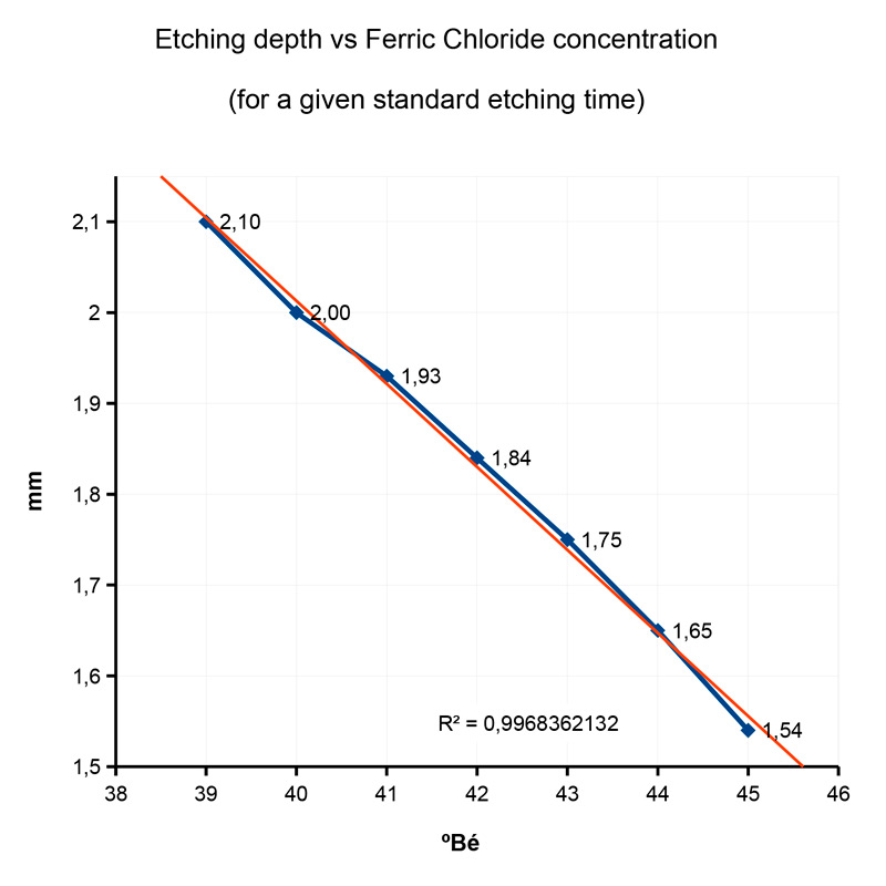 As can be observed, the etching power of the ferric chloride on copper rises up as a function of the concentration. This occurs up to 33ºBé approximately, from where the activity goes backwards decreasing again. If we take a portion of this plot, that corresponding to the concentrations between 39ºBé and 45ºBé (Fig., 2), we can realize that is almost linear. In addition to its capability of resist penetration using gelatinized paper, this is a good reason for the use of a group of dilutions highly recommended in many texts.