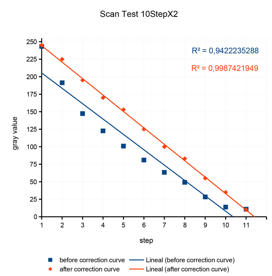 - Scan on and measure the grey value of the step wedge patches. Plot a graph that shows the tonal range progression. The goal is an as straight as possible line.