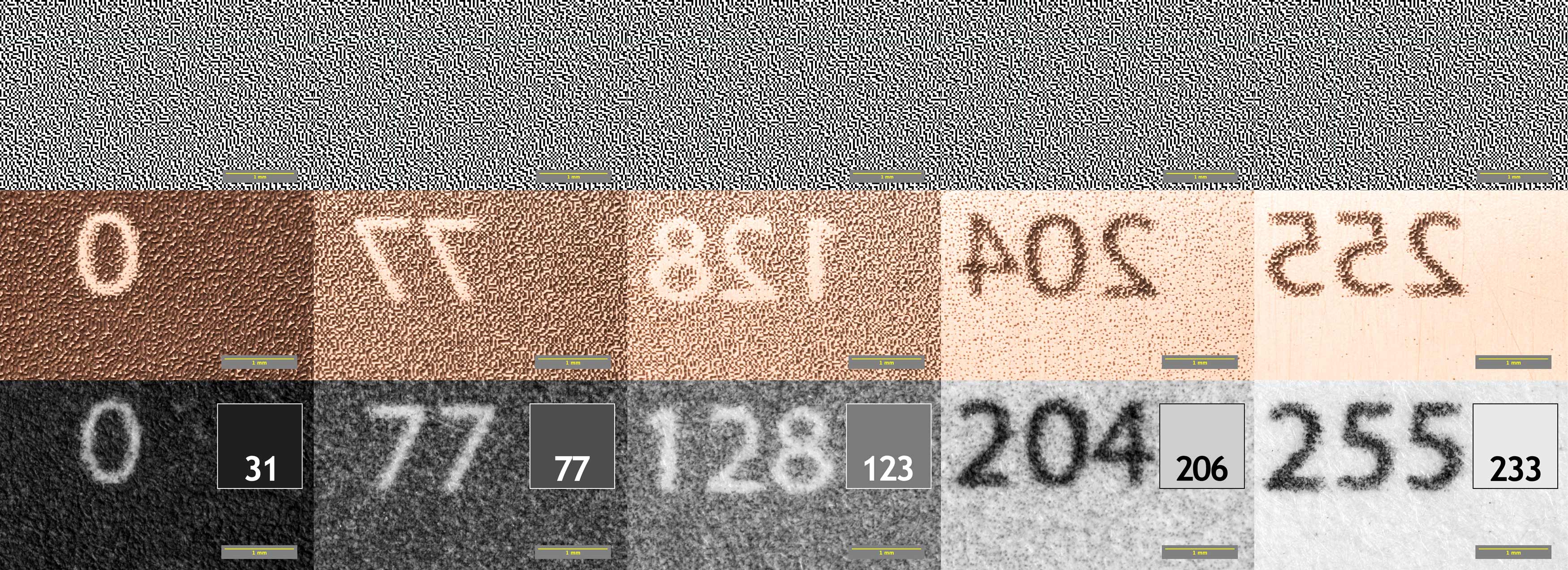 The simple visual analysis shows as although the screen scheme is clearly visible in all the gray patches on the plate, their geometrical properties are completely lost on the paper. Simply this verification informs us that the supposed “mechanical aspect” is not present on the final print paper. Additionally and because of the capabilities of the digital screen, the tiny dots the screen have an equal size of 0.028mm or 28µm. This is more than five times smaller than the published resolution values obtained with dust grain (1) and completely undetectable by the naked eye. Furthermore, the equal spacing between screen channels is a warranty to achieve an also uniform behaviour respecting the ferric chloride penetration and therefore, a better etching evenness all over the plate surface. This can be specially observed in the patch corresponding to the 100% black, at left. For the digital analysis, the patch corresponding to the gray value of 128 has been taken. This is the patch where the screen scheme is better present in the etched copperplate and therefore the more delicate if there is any mechanical transfer to the print.