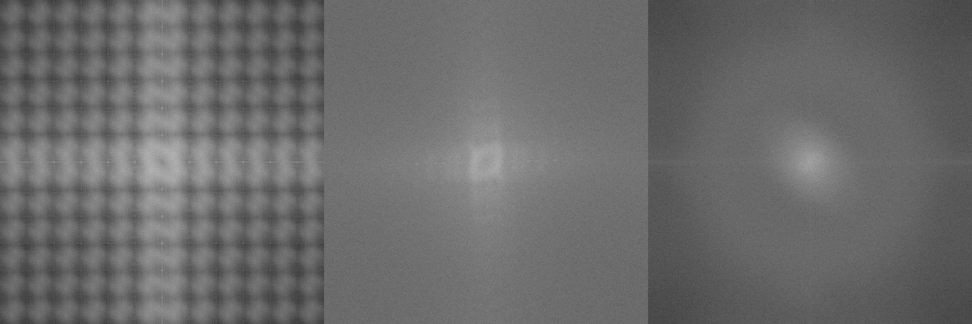 At left, on the power spectrum coming from the screen image, it is clearly present a lot of periodic peaks corresponding both from the pixels grid and the geometrical scheme caused by the dithering algorithm used to prepare the screen. The image at the center, coming from a thresholded version of the plate image, shows a lost of the high frequency periodicities, being present only a clearly periodic occurrence around the center of the spectrum. Finally, at right, the spectrum corresponding to the printed paper image do not show any clear peak of periodicity.