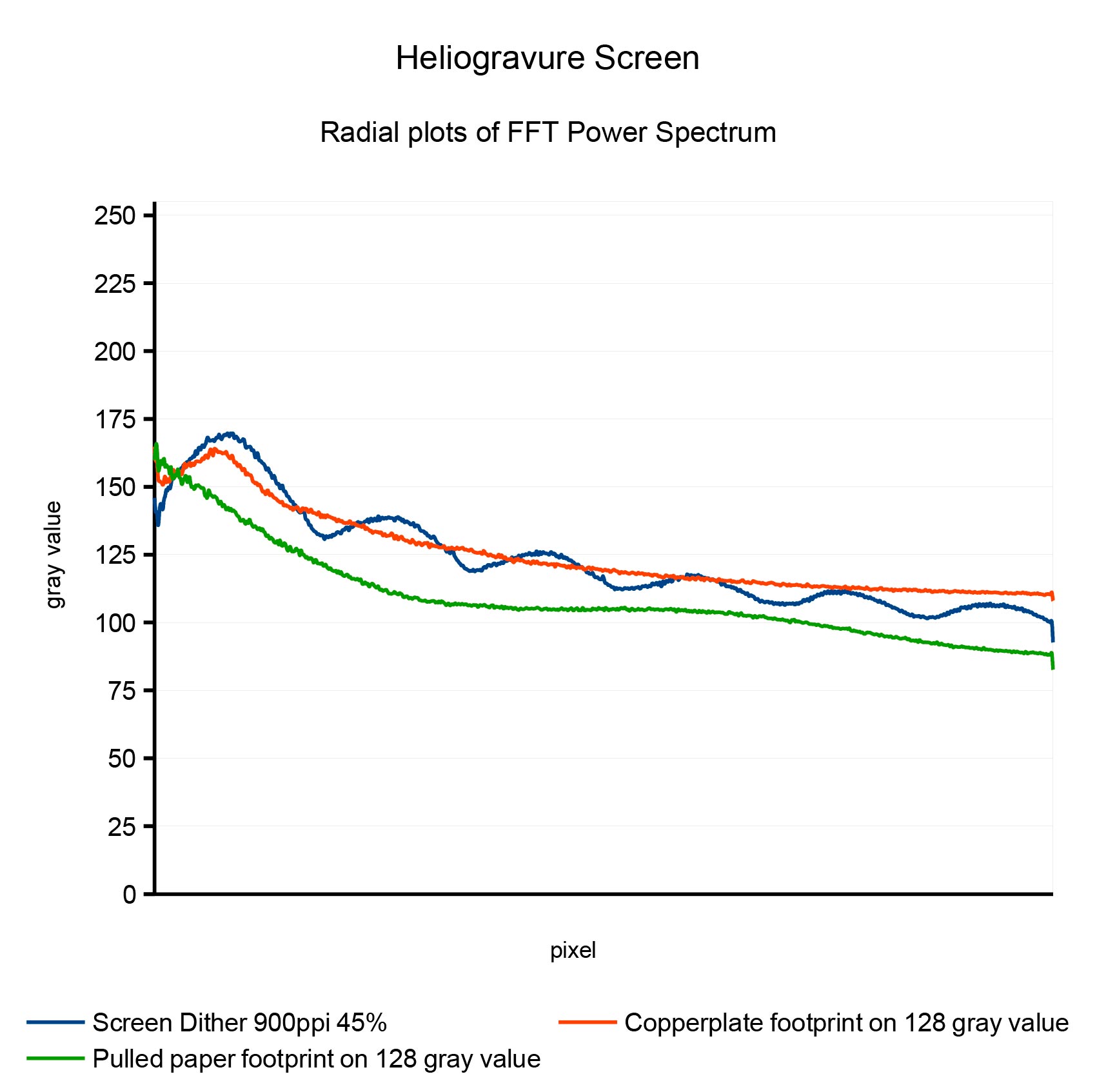 In order to better understand what it means, radial plot profiles have been taken from the three power spectrum and are plotted together in a single graph (Fig., 6). Compare in first place the two plots corresponding to the screen and the plate respectively. While that of the screen, in blue, shows up to six periodic peaks, the resulting from the plate image, in red, shows only one isolated peak. This peak is of the same frequency of the first in the screen power spectrum. This lost in higher frequency components is caused by the changes that the exposure to the UV light and the etching introduce on the screen scheme. The light do not penetrates the gelatin following an straight line, but scatters and causes a hardened pattern less precise as the screen pattern is. Thereafter, the etching suffers of uneven diffusion of the ferric chloride during the gelatin penetration and of a more or less important amount of lateral etching. The result is a more rounded and irregular aspect of the pattern present in the plate relating to the original pattern in the screen (Fig., 4).