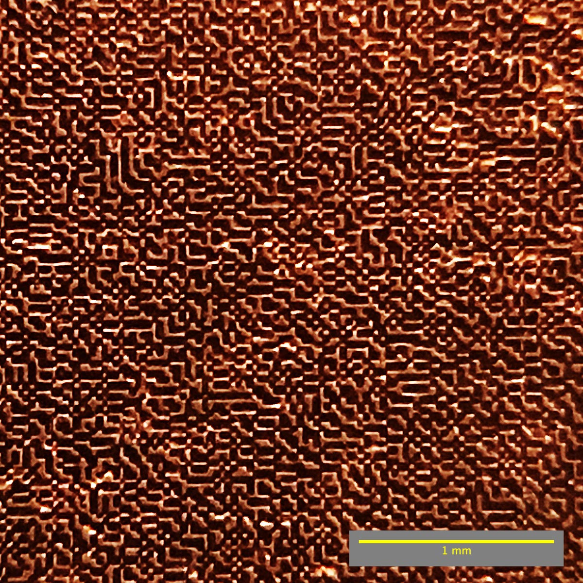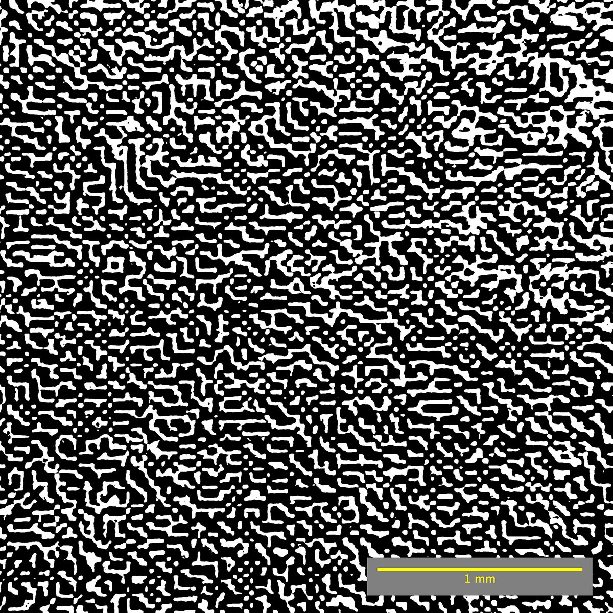 In order to perform measurements from the pictures taken with such a device, there is an app, the ProScope QC, allowing to display an overlay with a measurement scale on the device screen. The overlay can be also incorporated to the registered image. The reference scales shown in the Fig., 3 and 4 have been incorporated by digital image processing after a calibration procedure. The Fig., 3 was taken from a plate black region after inking and wiping was completed. The Fig., 4 is the result after applying a threshold to the image in the Fig., 3. This binarization allows to measure which is the ink coverage after etching (and lateral etching). In the case of the example, a plate black area coming from a digital screen with a 45% of black coverage, results in an etched plate where the inked area covers a 65% of the total surface.