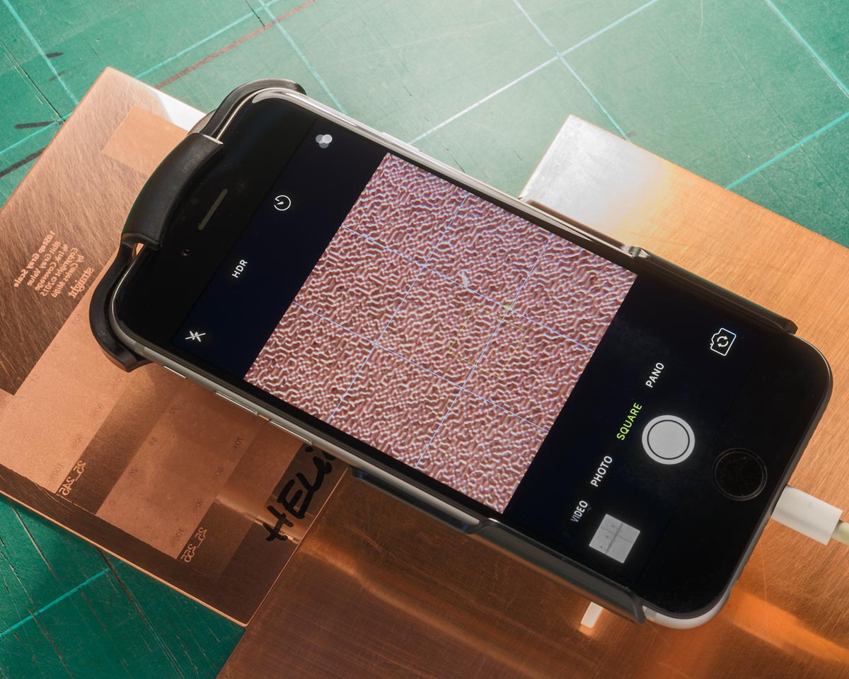 The ProScope MicroMobile basic unit incorporates a lens system from Edmund Scientific with a magnification power from 20x to 80x, an adjustable LED illumination system, a built in desktop stand and a battery container with USB charger connection. Over this basic unit it can be attached a plastic sleeve suited for the given cellular phone or tablet. This lens system acts as a photomacrography converter for the cellular phone or tablet camera lens. If we want to use more than one device, we need to buy only one basic unit and as many sleeves as devices. The Fig., 2 shows the device taking a picture from a test target copperplate in order to determine how the plate is affected by the lateral etching for a given etching sequence.