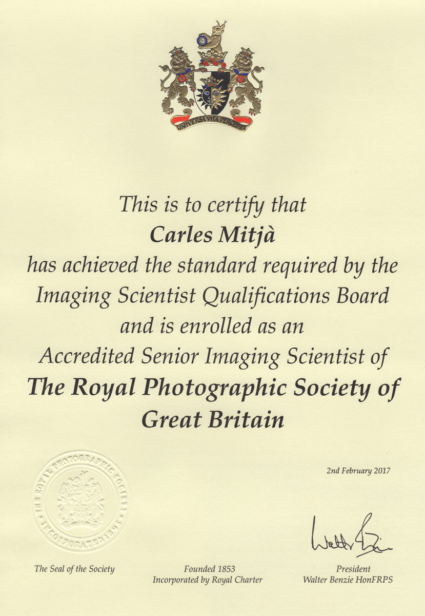 Past friday I received the official communication for the achievement of the Accredited Senior Imaging Scientist (ASIS) qualification implying the Fellow of the Royal Photographic Society distinction (FRPS) (http://www.rps.org/distinctions). It is obvious I’m proud of this distinction and because of that I want be grateful to the Council of the RPS and to all imaging people community that shares with me the passion for Photography. Thanks to all.